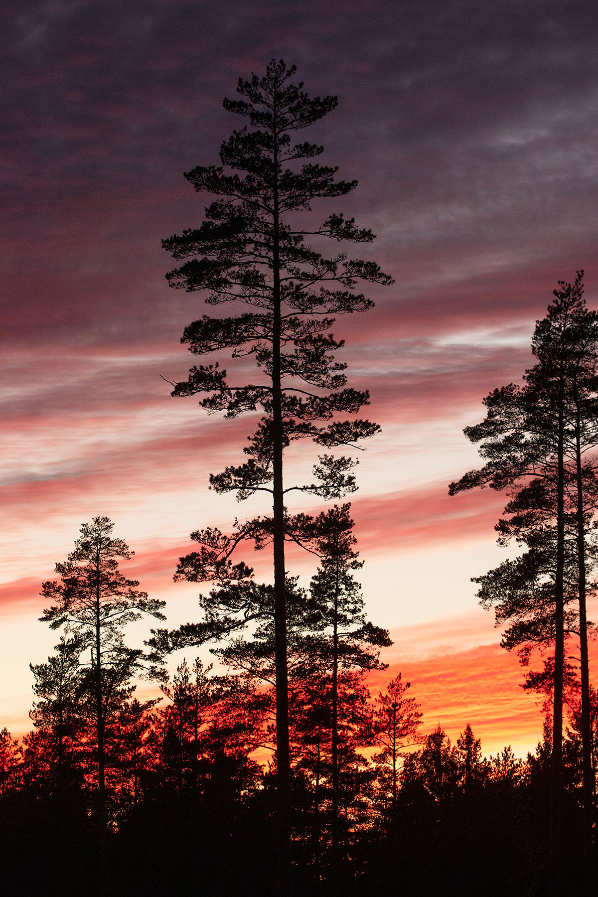Päeva lõpp palumetsade keskel, kus puude sünkjad siluetid vaikselt pimedusse sulanduvad. Eesti, 2018. aasta sügis.